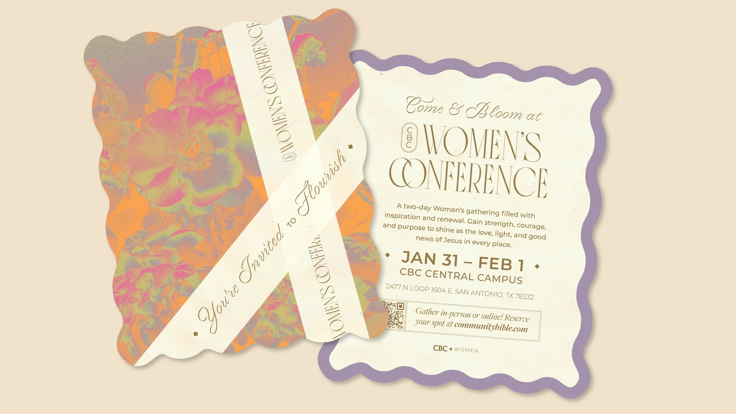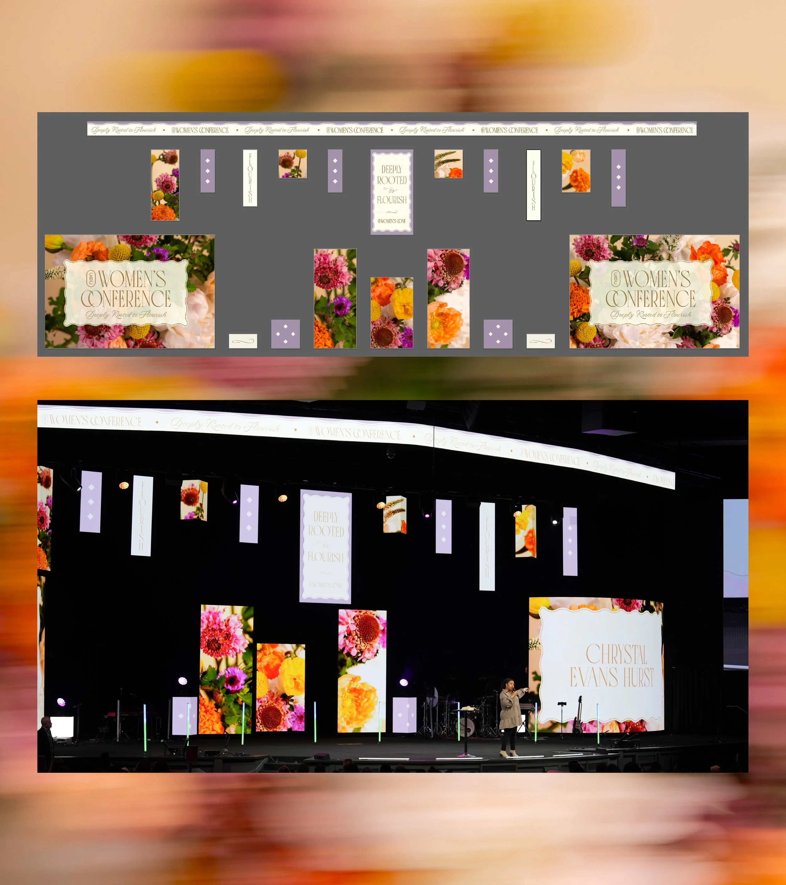 The artwork drew from macro shots of floral arrangements, blending vibrant botanical imagery with sophisticated typography and a warm pastel palette. The result was a cohesive brand that reflected grace, elegance, and peace across every touchpoint, including promotional artwork, a merchandise line, lanyards and badges, vinyl designs for photo ops, production LEDs and graphics, and many other assets that helped create a unified and meaningful experience for the women of CBC.